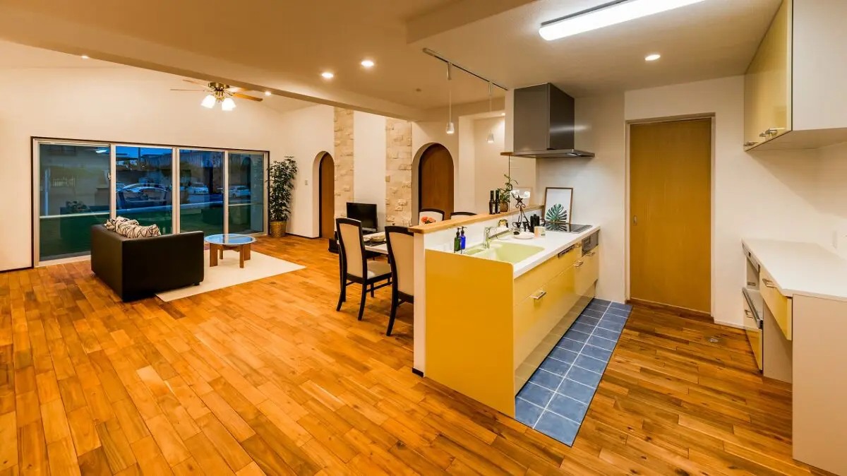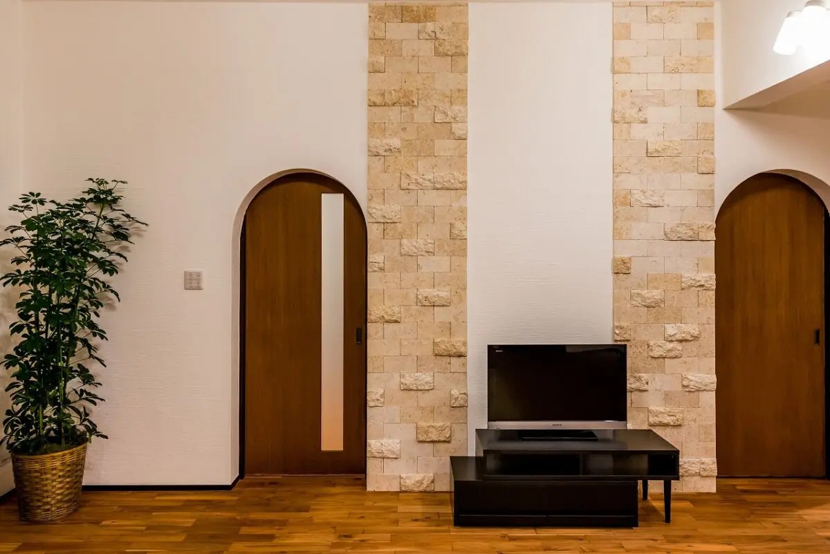 เมื่อเข้ามาภายในบ้าน เราก็จะพบกับรูปแบบการตกแต่งตรงมุมนี้ที่มีผนังตกแต่งด้วยกระเบื้องลายหิน พร้อมกับมีประตูทรงโค้ง อันเป็นดีไซน์แบบยุโรปนั่นเอง