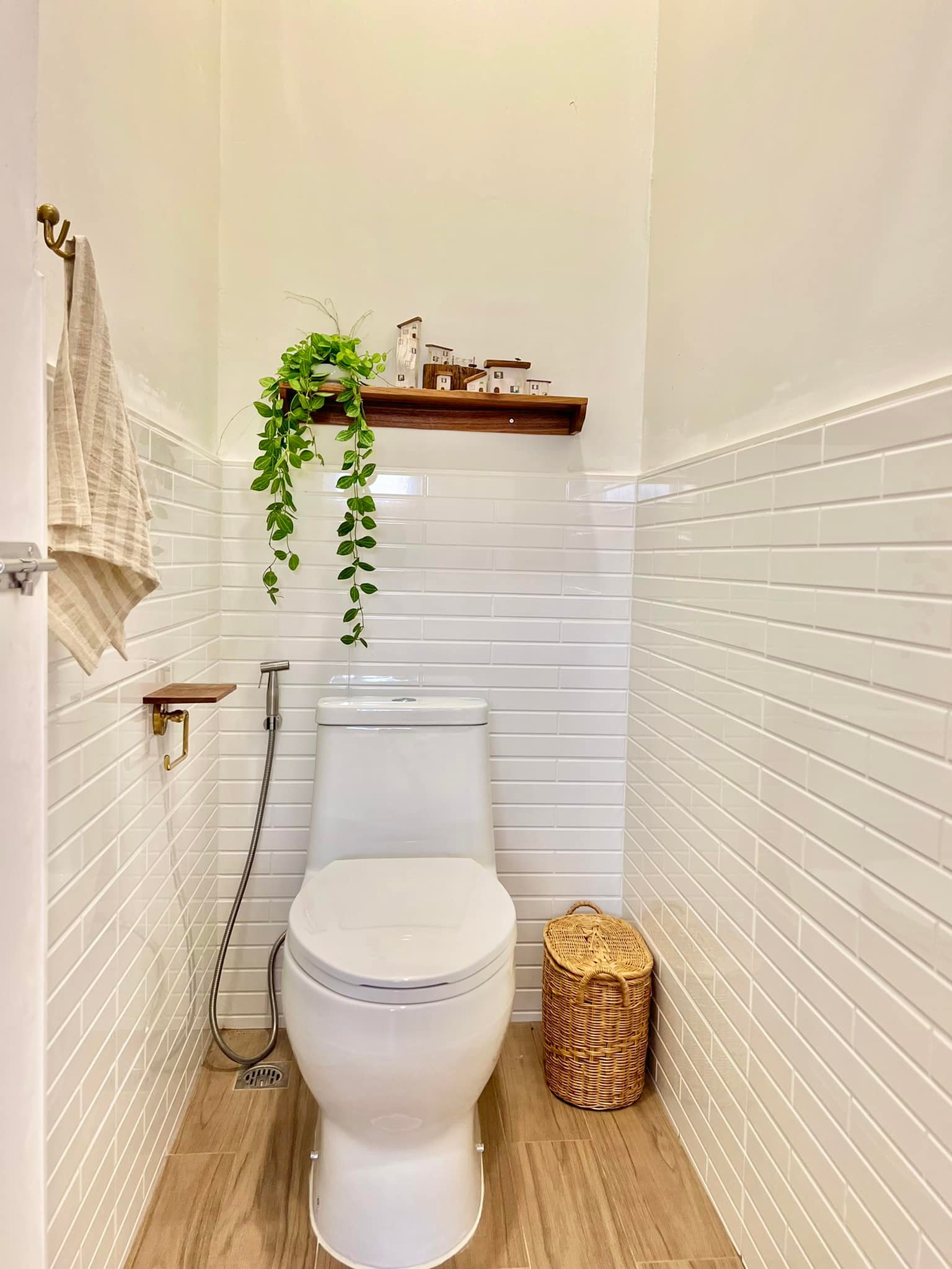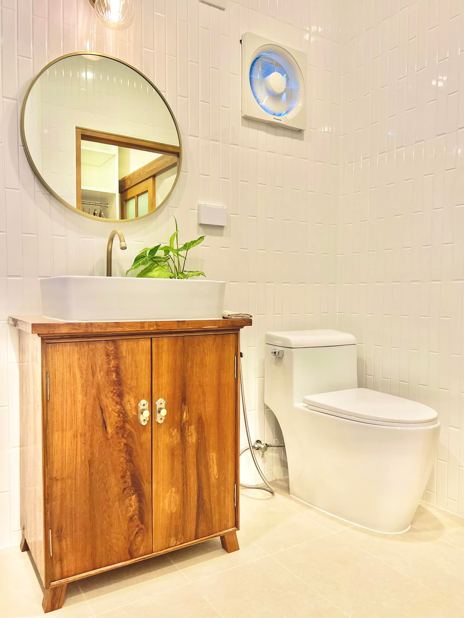 โถสุขภัณฑ์ถูกจัดวางตำแหน่งในจุดที่เหมาะสม ด้านบนมีพัดลมระบายอากาศ จึงหมดปัญหาเรื่องกลิ่นไม่พึงประสงค์และความชื้นในห้องน้ำได้ดีเลย