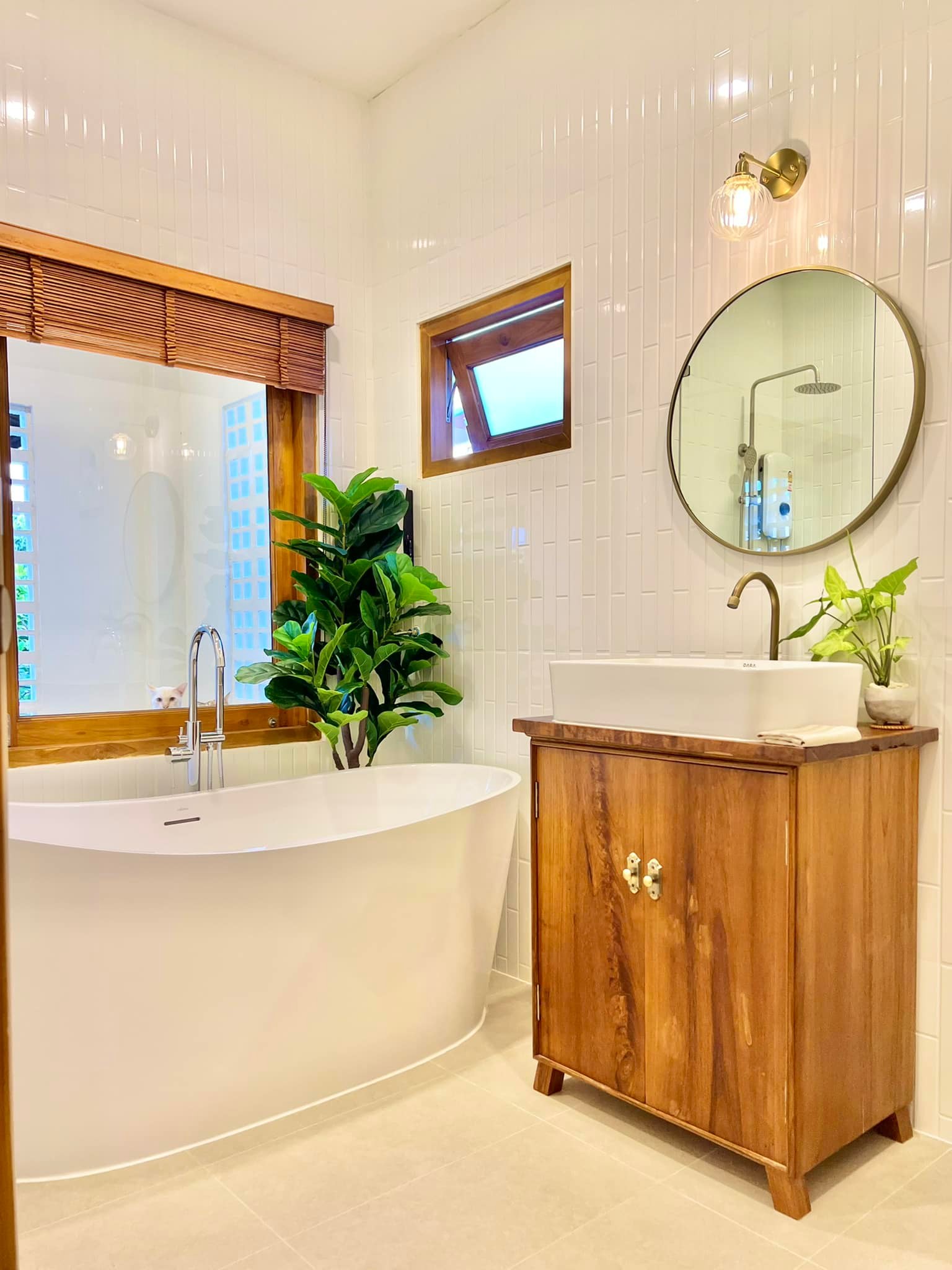 ภายในห้องน้ำ เป็นส่วนที่ออกแบบและตกแต่งออกมาได้ดีเลย ให้บรรยากาศทั้งมินิมอลและหรูหราไปพร้อมกัน โดยมีอ่างแช่ตัวพร้อมมุมชมบรรยากาศด้านนอก