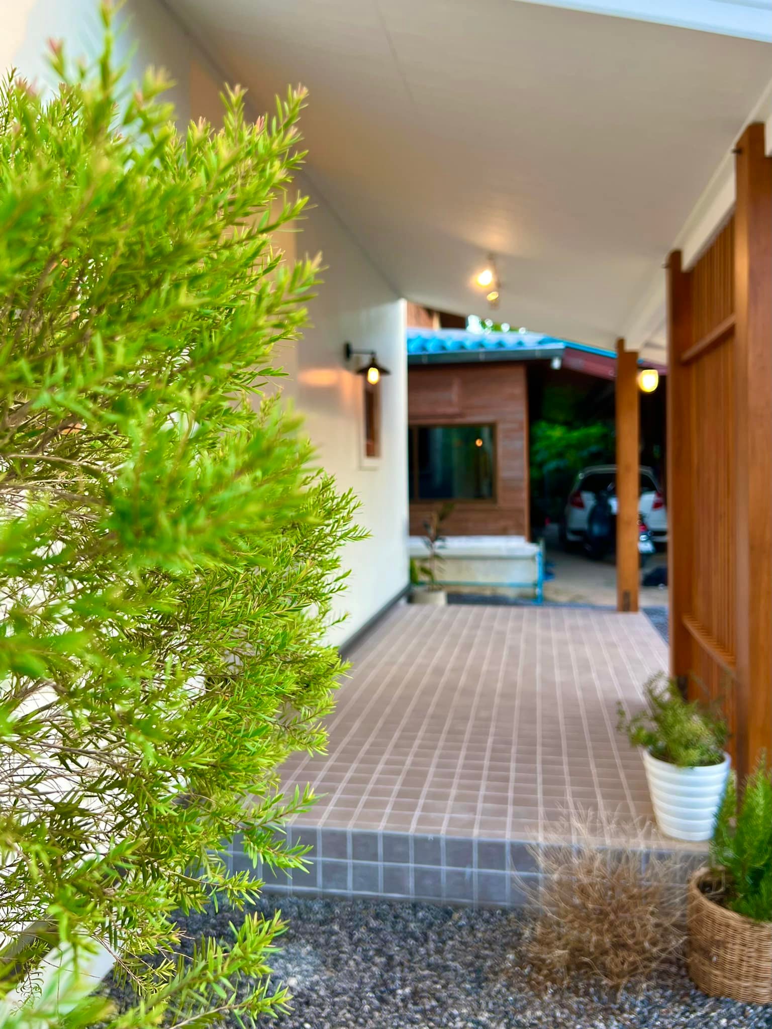 แค่องค์ประกอบในภาพรวมของบ้านหลังนี้ก็ดูมีความเป็นญี่ปุ่นแล้ว โดยเฉพาะพื้นที่ด้านนอกที่เทพื้นหินกรวด พร้อมกับการประดับด้วยต้นไม้เล็ก ๆ ในหลายจุด