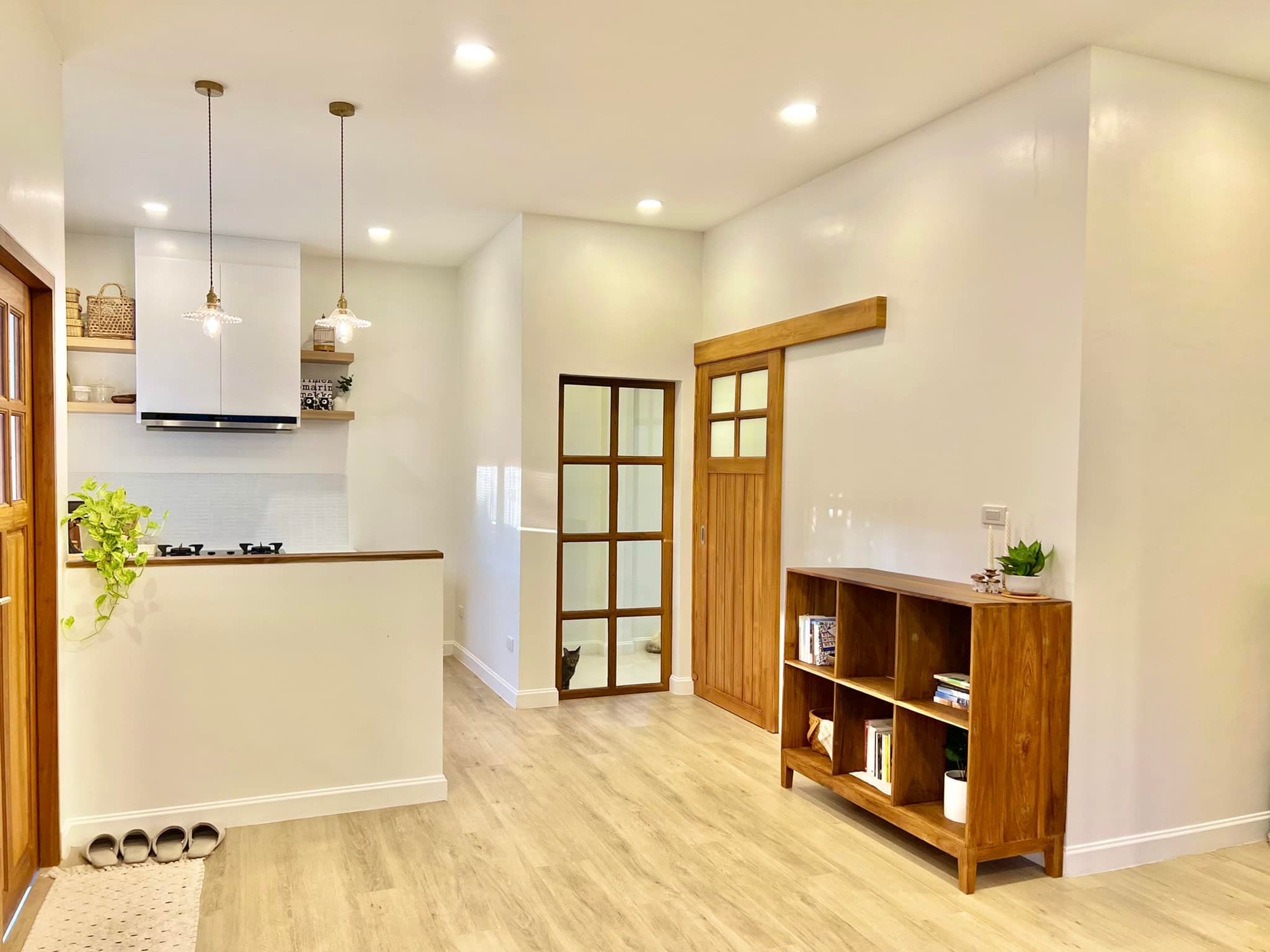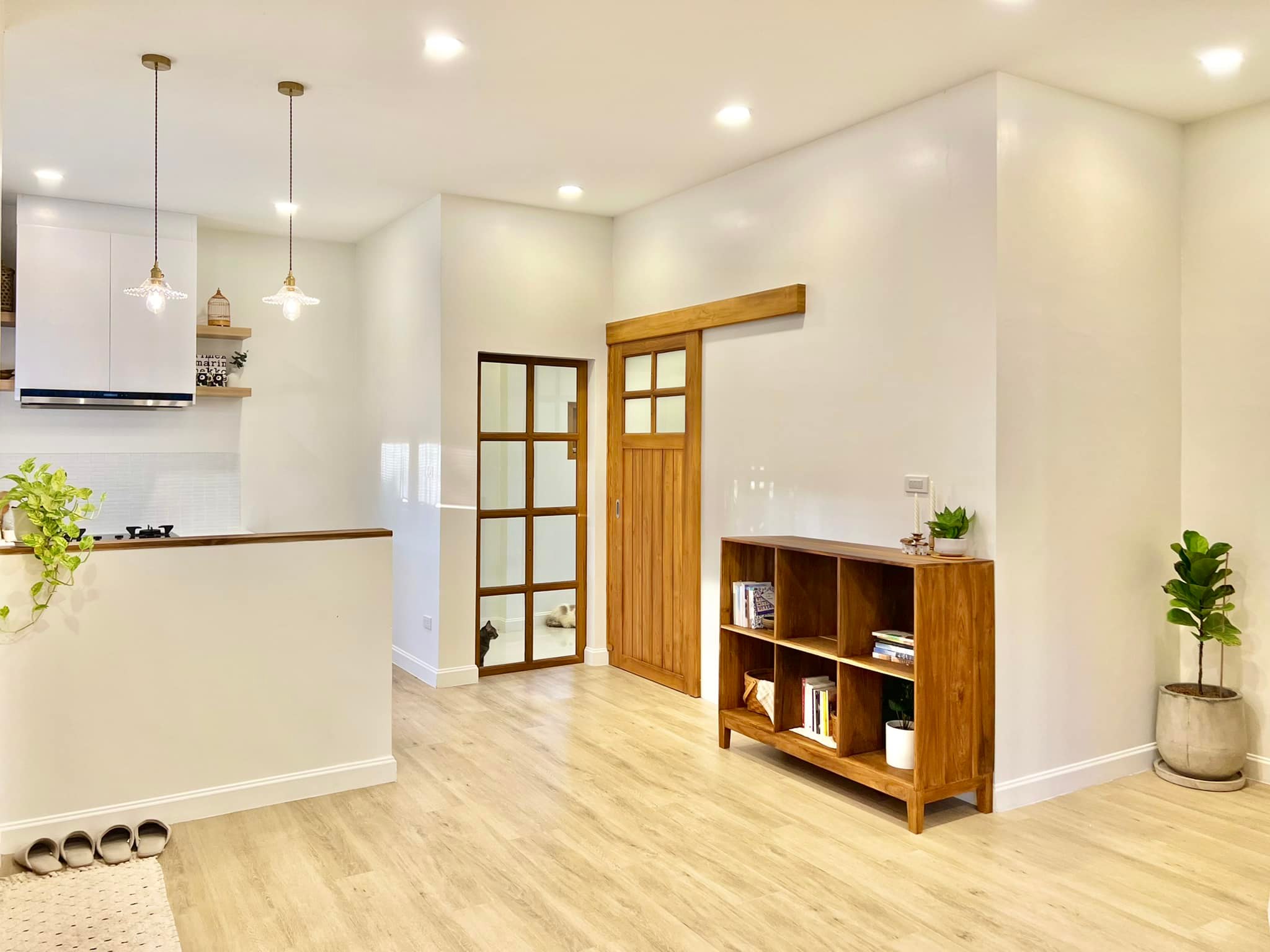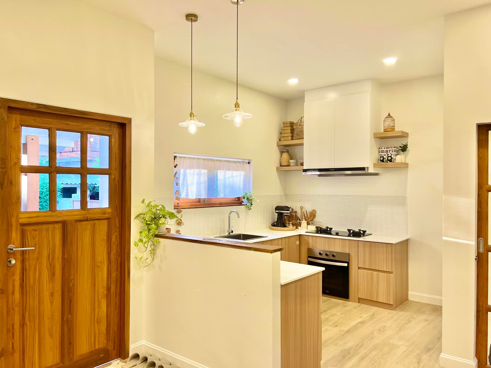 ห้องครัวจะอยู่ส่วนหน้าบ้านเลย เปิดประตูเข้ามาก็เจอแล้ว เป็นครัวแบบโมเดิร์นที่เหมาะกับวิถีชีวิตและการทำอาหารของคนยุคใหม่เลยล่ะ