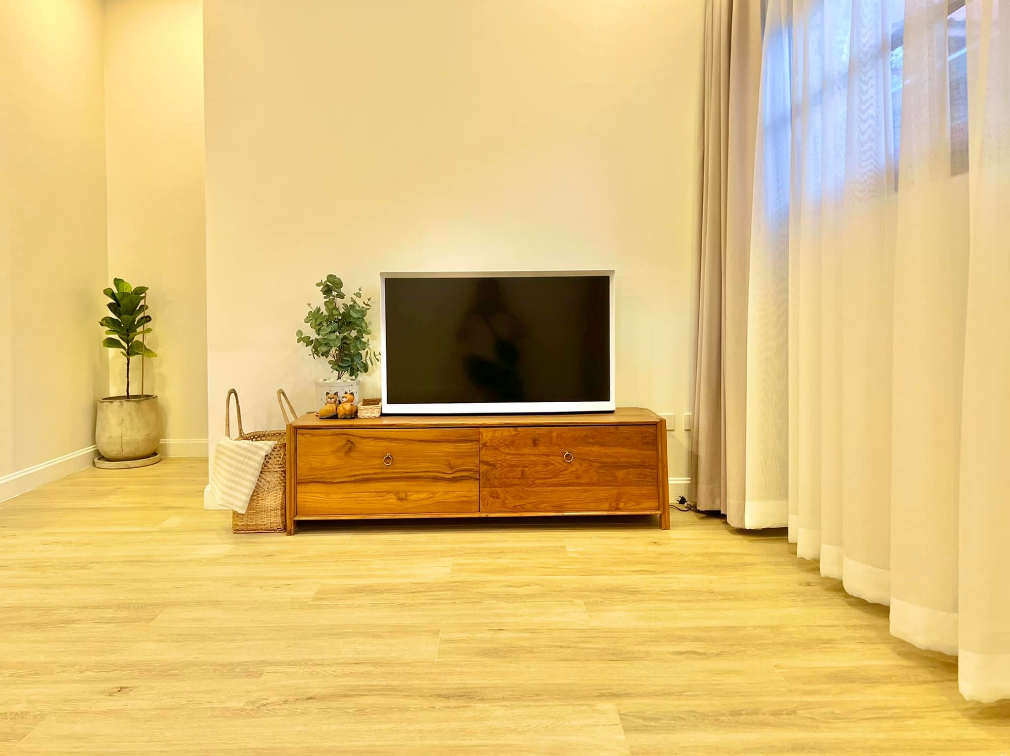 มุมนั่งเล่นจะปล่อยให้เป็นพื้นที่โล่ง ๆ มีชั้นวางทีวีแบบง่าย ๆ มีบรรยากาศที่อบอุ่นน่ารัก เหมาะกับการนำฟูกนุ่ม ๆ มาปูเพื่อเพลิดเพลินไปกับหนังเรื่องโปรดได้เลย