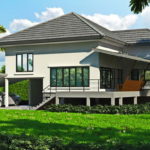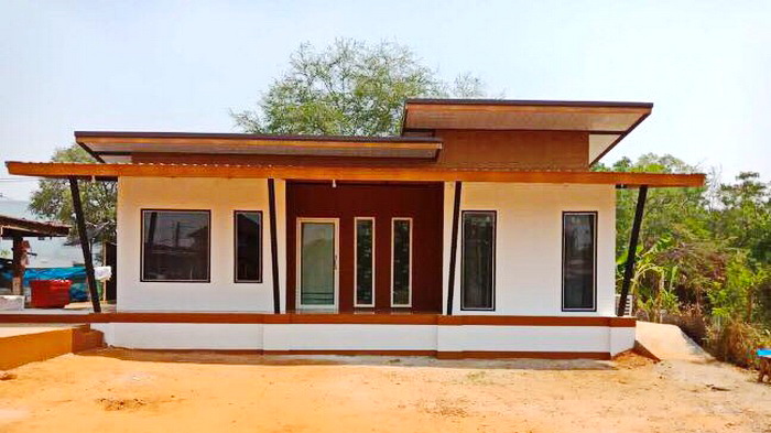 ลักษณะบ้านสไตล์โมเดิร์น ขนาดกะทัดรัด ตัวบ้านออกแบบยกพื้นต่ำ ผนังภายนอกตกแต่งด้วยโทนสีขาว สลับกับโทนสีน้ำตาล หลังคาบ้านออกแบบด้วยหลังคารูปทรงเพิงหมาแหงน เข้ากับตัวบ้านรูปทรงสี่เหลี่ยมได้เป็นอย่างดี เหมาะกับคนที่กำลังมองหาบ้านขนาดที่พอเหมาะ