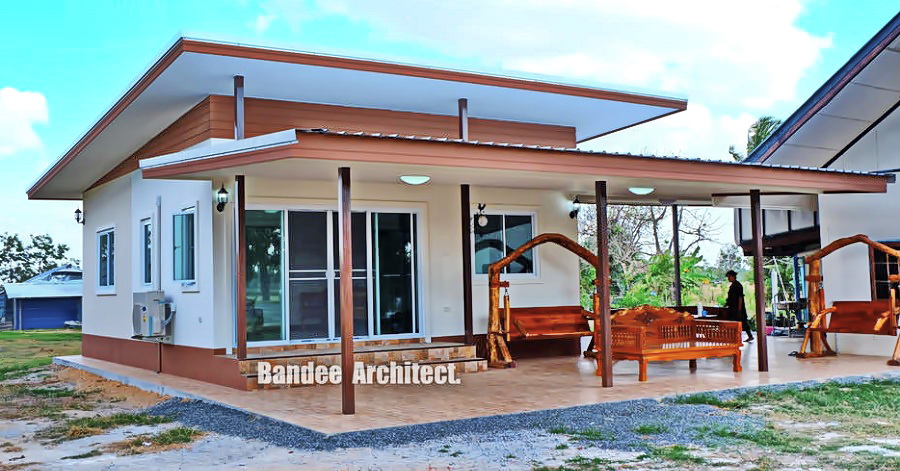 บ้านหลังนี้ก่อสร้างบนที่ดิน 52 ตารางวา ลักษณะบ้านชั้นเดียวยกพื้น ผนังก่ออิฐฉาบปูน ภายนอกตกแต่งคุมโทนสีครีม-น้ำตาล กรุแค่งเพิ่มลูกเล่นด้วยแผ่นไม้เทียมสีเข้มบริเวณใต้หลังคา ปิดทับด้วยเมทัลชีททรงเพิงหมาแหงน