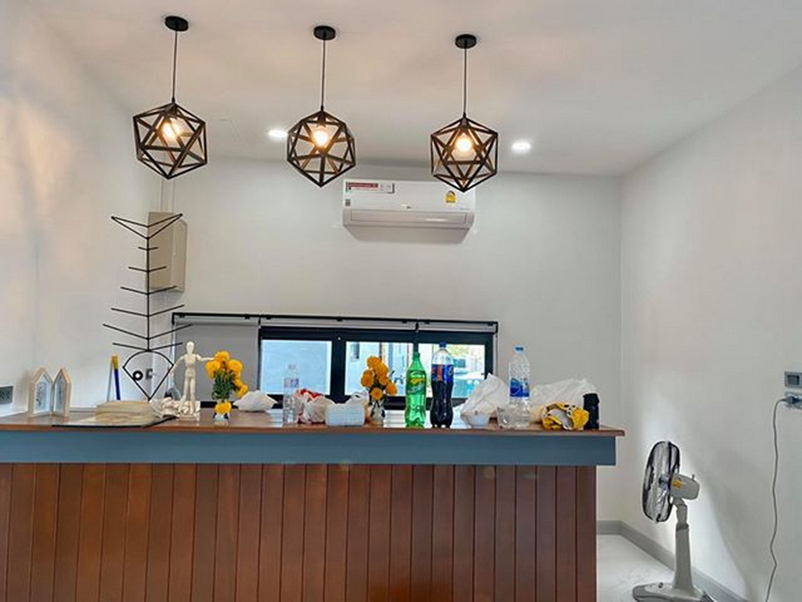 มุมนี้เป็นมุมห้องครัวและมินิบาร์ ซึ่งสามารถใช้เป็นมุมสังสรรค์จัดเลี้ยงภายในบ้านได้เป็นอย่างดี ภายในโดดเด่นด้วยโคมไฟที่มีดีไซน์แบบโมเดิร์น