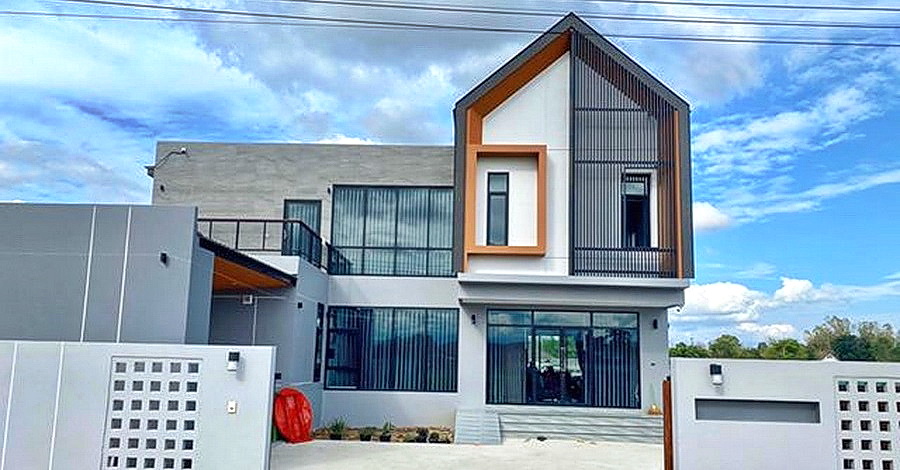 โดยบ้านหลังนี้เป็นบ้านขนาดสองชั้น ตัวบ้านมีรูปทรงพื้นฐานแบบเรขาคณิต ความโดดเด่นอยู่ที่บริเวณหน้าบ้านที่ดีไซน์หลังคาทรงหน้าจั่ว นอกจากนี้ยังมีการตกแต่งที่หลากหลาย เช่น ผนังปูนเปลือยที่ให้กลิ่นอายแบบอินดัสเทรียล ลอฟท์อีกด้วย