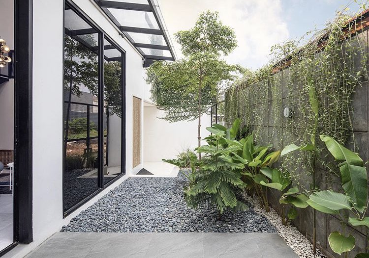 เมื่อเข้ามาภายในพื้นที่บ้าน หากเราลองเดินไปบริเวณด้านข้าง ก็จะพบกับการจัดสวนเล็ก ๆ เอาไว้สร้างความสดชื่นให้บ้าน พื้นถูกเทด้วยหินกรวดที่จะช่วยป้องกันโคลนที่อาจจะเลอะเทอะกับภายในบ้านได้