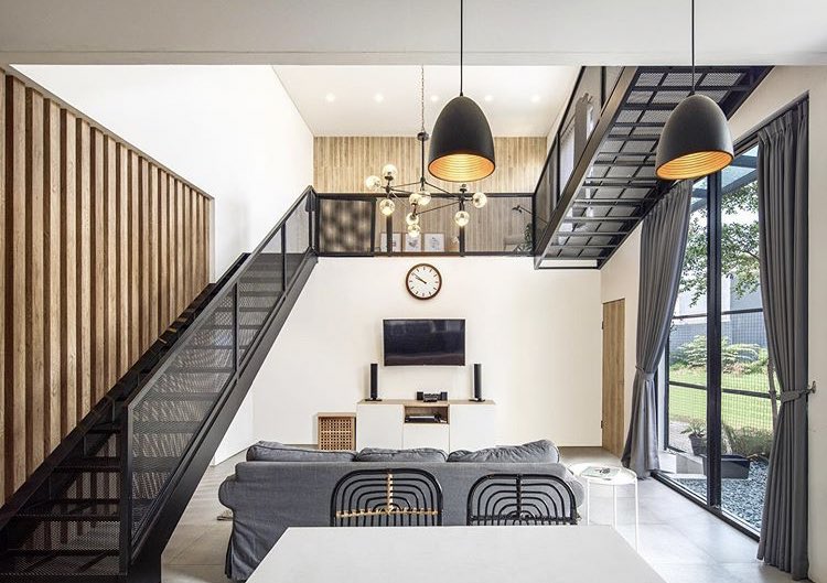 ภายในบ้านผสมผสานการตกแต่งในแบบโมเดิร์นกับอินดัสเทรียลลอฟท์เข้าไว้ด้วยกัน ผ่านเฟอร์นิเจอร์ที่ให้ความทันสมัย พร้อมกับบันไดทางเดินและชั้นลอยเหล็กแบบลอฟท์