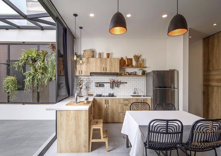 พื้นที่มุมนี้เป็นห้องครัวที่มีส่วนของเคาน์เตอร์ครัวเป็นงานไม้ที่มีกลิ่นอายอบอุ่นแบบมินิมอล ด้านข้างยังเปิดโล่ง เชื่อมต่อไปยังลานกว้างนอกบ้านที่มีความโปร่งสบาย