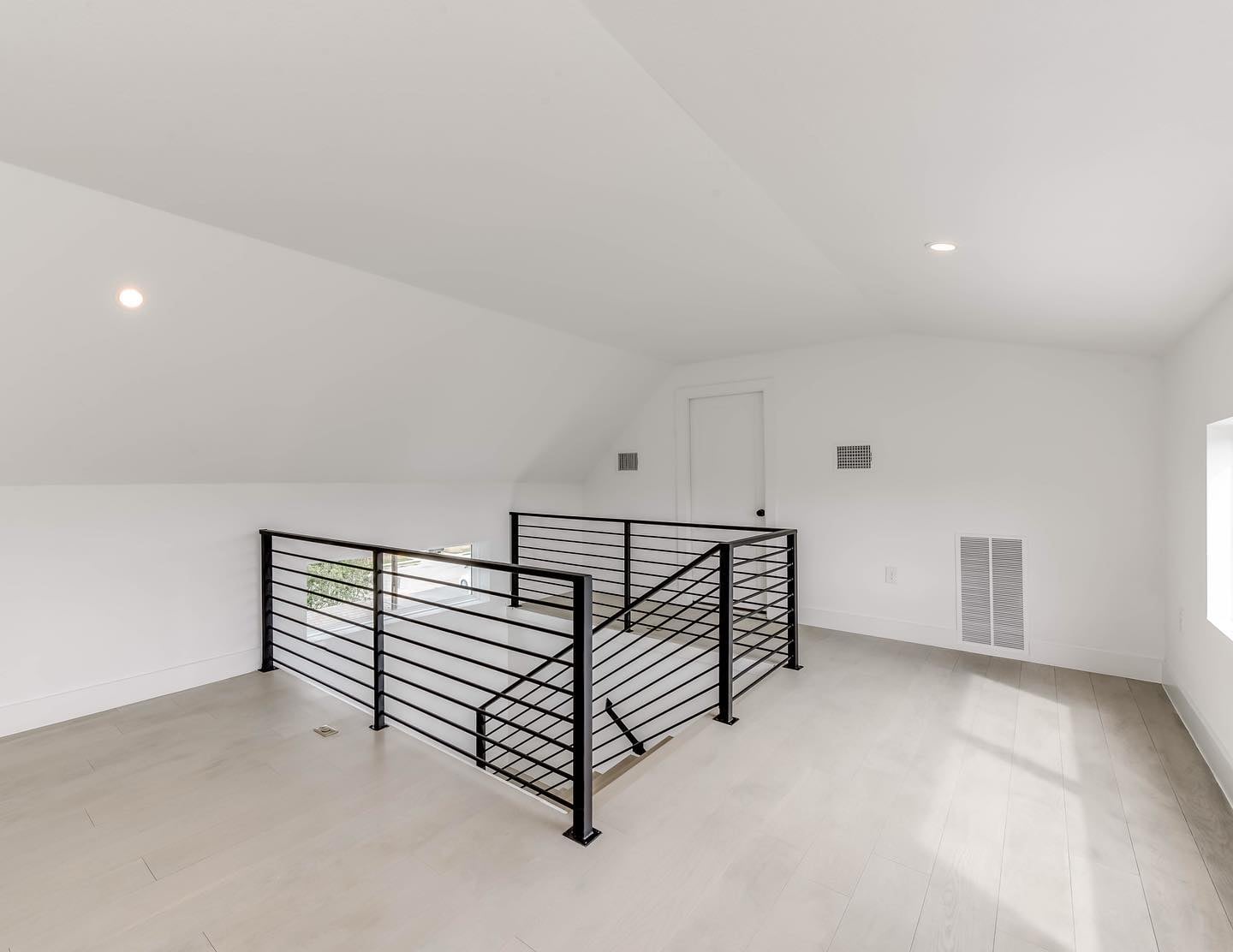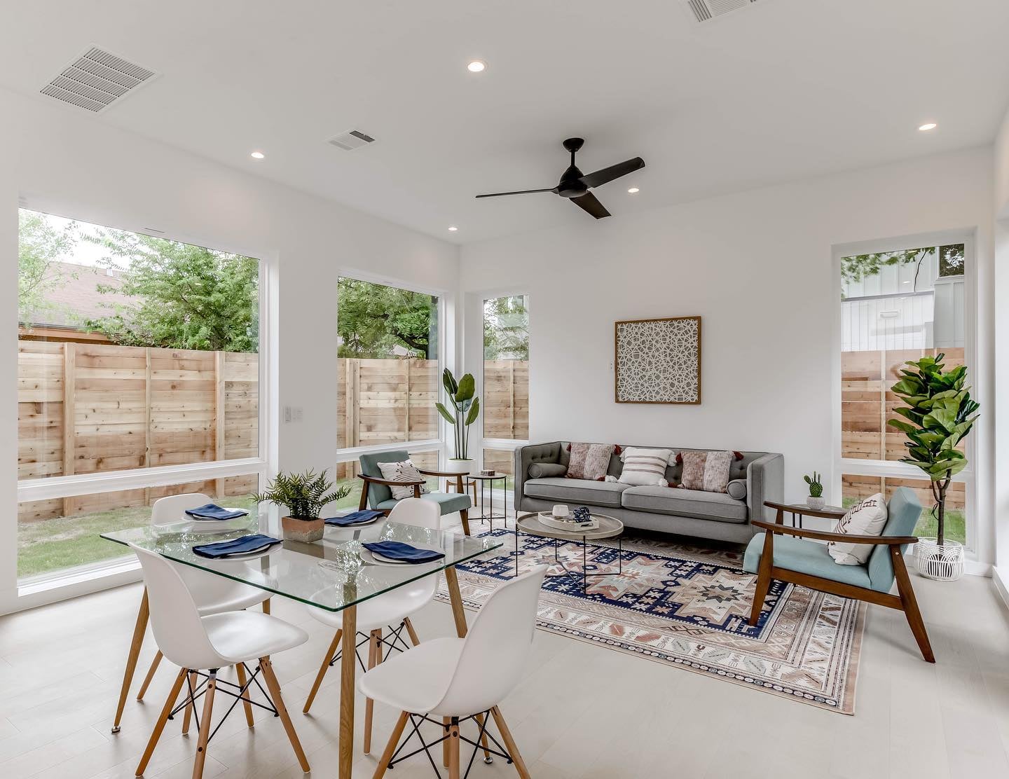 ภายในบ้านถูกตกแต่งในโทนสีขาว เมื่อผสานกับการออกแบบบานหน้าต่างโดยรอบ จึงทำให้เป็นห้องที่มีความโปร่งสบายสุด ๆ