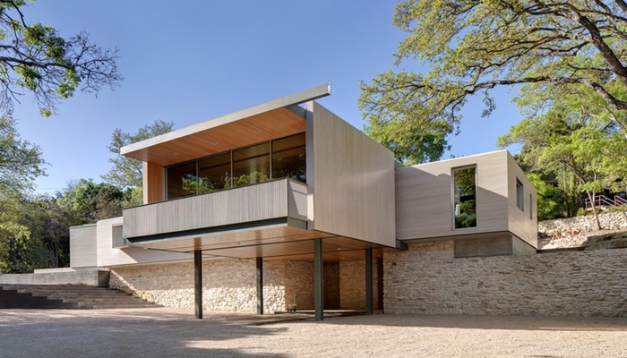 ตัวบ้านสองชั้น รูปทรงกล่องสี่เหลี่ยม โครงสร้างคอนกรีต ใช้การยื่นของตัวผนังบ้านในชั้นสอง โดยมีเสาลอยลองรับเอาไว้ บ้านโทนสีเทา วัสดุปิดผิวเช่นไม้ หินทราย ให้อารม์ดิบๆ อาร์ตๆ ไปในตัว มากับหลังคาทรงแสลป ซ่อนการระบายน้ำเอาไว้ ใช้กระจกตกแต่งให้ทันสมัยมากขึ้น