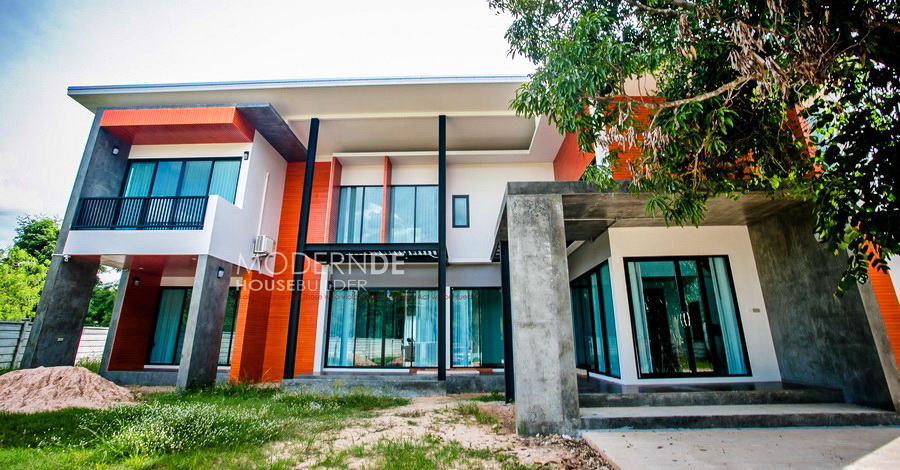 ลักษณะบ้านขนาดสองชั้น ออกแบบตัวบ้านด้วยสไตล์แบบโมเดิร์นลอฟท์ โดยภายนอกตกแต่งอย่างหลากหลายด้วย ผนังโทนสีขาว สีส้ม และผนังปูนเปลือย ที่ผสานความสวยงามกันได้อย่างลงตัว หลังคาของบ้านเป็นหลังคาแบบเรียบจึงให้ความกลมกลืนกับรูปทรงของบ้าน