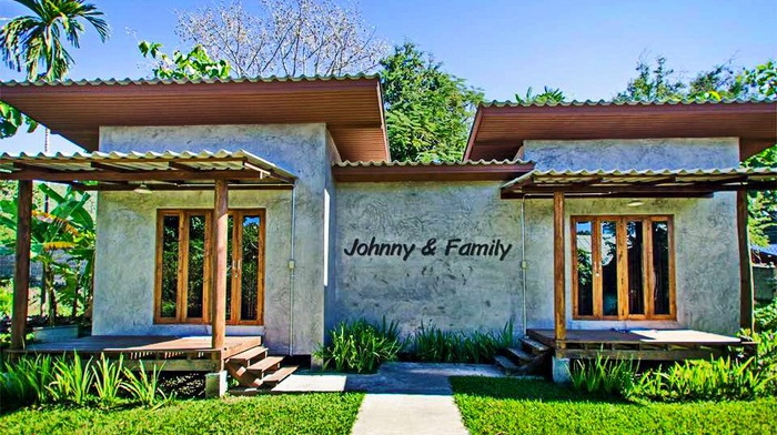 Johnny & Family เป็นบ้านตากอากาศในเครือ Prilpai Guesthouse & Cafe’ ทำเลที่ตั้งอยู่ในอำเภอปาย จังหวัดแม่ฮ่องสอน ออกแบบด้วยโครงสร้างบ้านคอนกรีตทรงเหลี่ยมหน้ากว้าง ผนังภายนอกตกแต่งปูนเปลือยขัดมัน ลงตัวไปกับงานไม้ของประตูทางเข้าและหลังคากันสาด