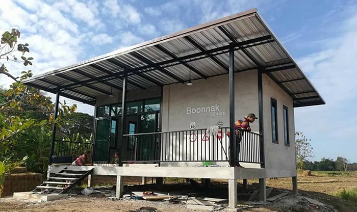 บ้านหลังนี้ ก่อสร้างขึ้นที่จังหวัดเพชรบูรณ์ ลักษณะเป็นบ้านยกพื้นสูง เปิดโล่งบริเวณใต้ถุนเพื่อกระจายความร้อนออกจากตัวบ้าน โครงสร้างคอนกรีตเสริมเหล็ก ผนังก่ออิฐบล็อกตกแต่งดีไซน์ปูนเปลือย โดดเด่นด้วยหลังคาโครงเหล็กสีดำ มุงเมทัลชีททรงเพิงหมาแหงน สะท้อนการตกแต่งที่ดูเข้ากับยุคสมัย