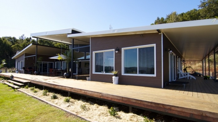 Hinterland ลักษณะบ้านสไตล์โมเดิร์นยกพื้นสูง โครงสร้างประกอบด้วยตู้คอนเทนเนอร์จำนวน 7 ตู้ หลังคาแบบผสมผสานระหว่างทรงเพิงหมาแหงนและทรงแบบ ภายนอกใช้โทนสีน้ำตาลเข้มให้ความรู้สึกอบอุ่น กลมกลืนไปกับพื้นไม้ยกระดับของบ้าน