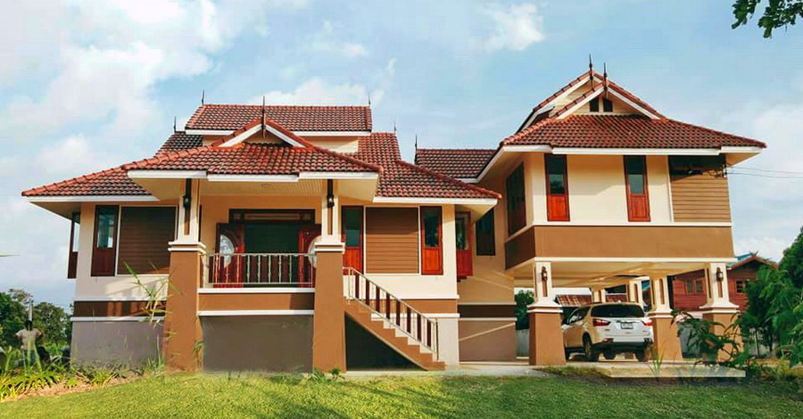 ลักษระบ้านขนาดชั้นเดียว ฐานของบ้านถูกยกพื้น และะยกใต้ถุนขึ้นสูง ตัวบ้านออกแบบด้วยสไตล์แบบบ้านทรงไทยที่ผสานไปกับความโมเดิร์น จนให้ความสวยงามลงตัว หลังคาของบ้านถูกออกแบบอย่างสวยสง่าด้วยหลังคาทรงมะนิลาแบบเล่นระดับ ผนังภายนอกเลือกใช้โทนสีน้ำตาลเป้นหลัก แซมด้วยสีครีม ให้บรรยากาศที่อบอุ่น