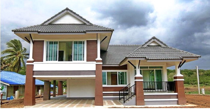 ลักษณะบ้านขนาดสองชั้น ออกแบบด้วยรูปทรงไทย ผสานกับสไตล์โมเดิร์นดครงสร้างของบ้านเลือกใช้วัสดึคอนกรีตทั้งหลัง ให้ความแข็งแรงคงทน หลังคาของบ้านดีไซน์ด้วยหลังคาทรงมะนิลา มุงด้วยกระเบื้องลอน นอกจากนี้ตัวบ้านยังออกแบบใต้ถุนยกสูงอีกด้วย