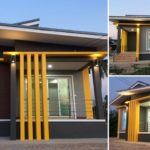 BluePrint-208 เป็นแบบบ้านสไตล์โมเดิร์นชนบท มีขนาดชั้นเดียว ผนังภายนอกตกแต่งด้วยโทนสีฟ้า ที่ช่วยให้ความรู้สึกที่ผ่อนคลายและสบายตา โดนฐานเลือกใช่ในโทนสีฟ้าเข้มเพื่อช่วยป้องกันคราบสกปรกจากพื้นดิน ถัดขึ้นมาจึงเลือกใช้ในโทนสีอ่อน และกลับมาใช้โทนสีเข้มอีกครั้งในส่วนของโครงสร้างคานของหลังคา