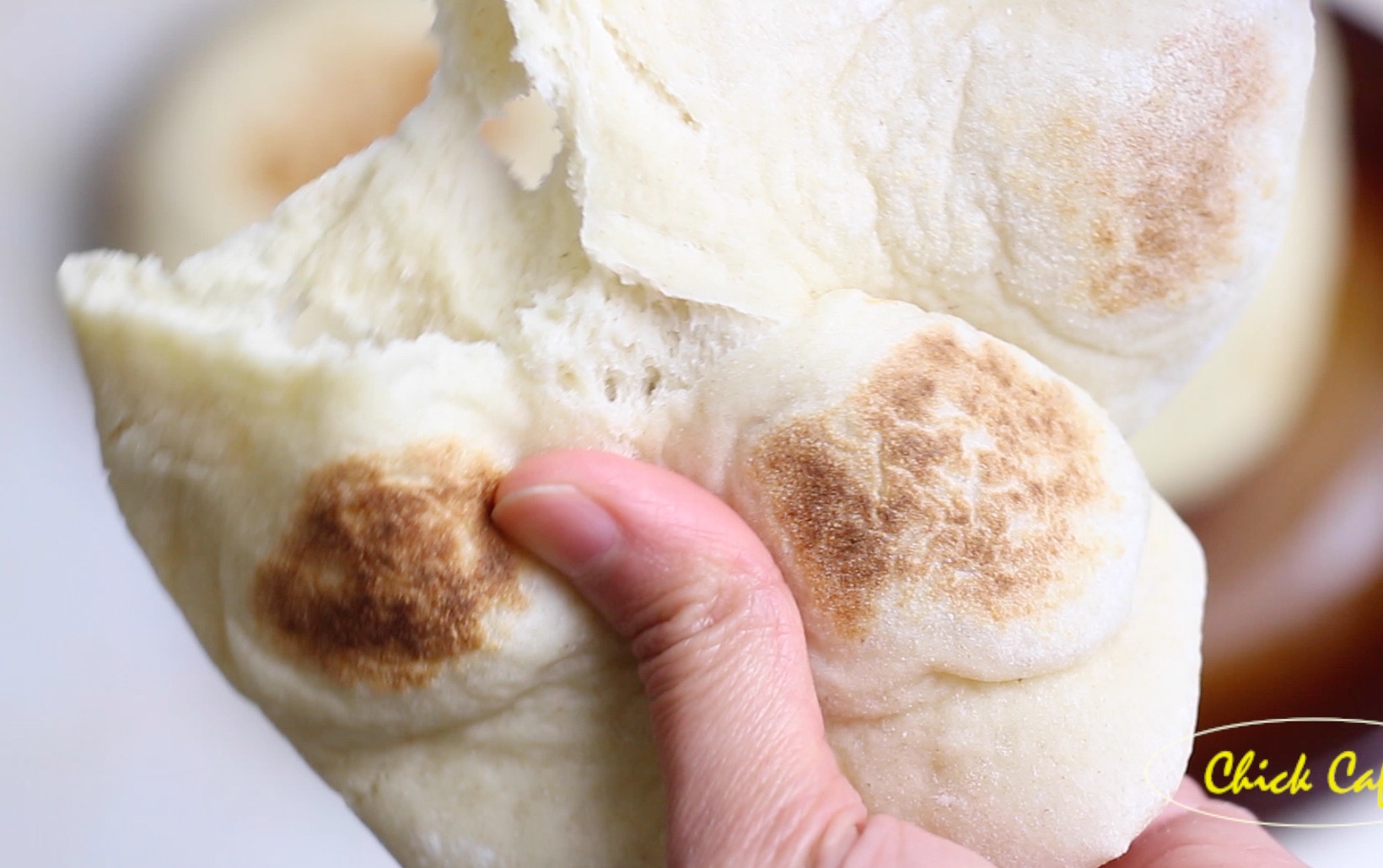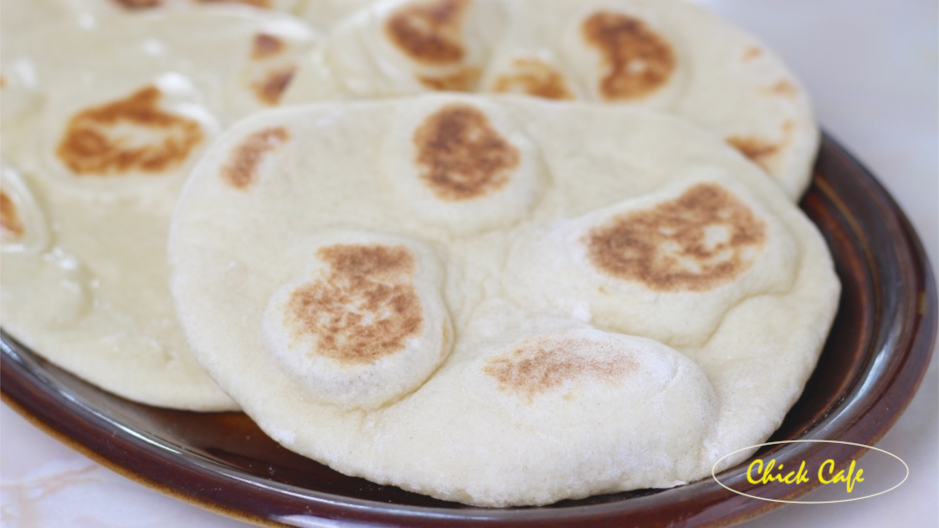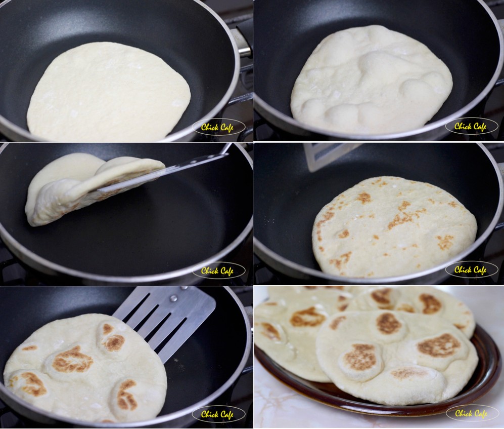 เมื่อกระทะร้อนนำแป้งลงไปจี่ พอแป้งเริ่มพองตัวก็พลิกดูอีกด้าน หากมีสีน้ำตาลออกทองก็กลับแป้งได้ จี่ทั้งสองด้านสุกดี ก็ยกเสิร์ฟได้เลย (หมายเหตุ : หากทาเนยละลายบนตัวแป้งก่อนเสิร์ฟจะช่วยให้หอมอร่อยยิ่งขึ้น)
