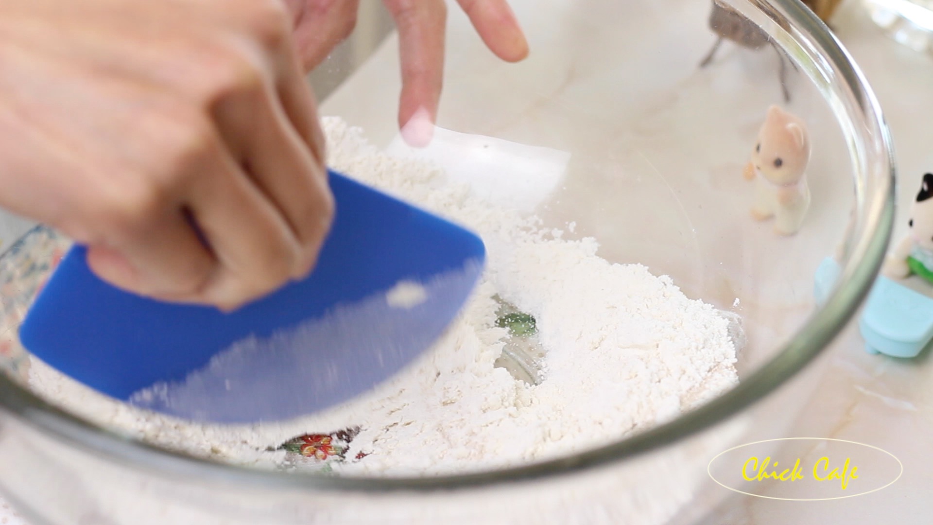 ใส่แป้งอเนกประสงค์ ยีสต์แห้ง น้ำตาล และเกลือลงในถ้วย ผสมแล้วคนให้เข้ากัน