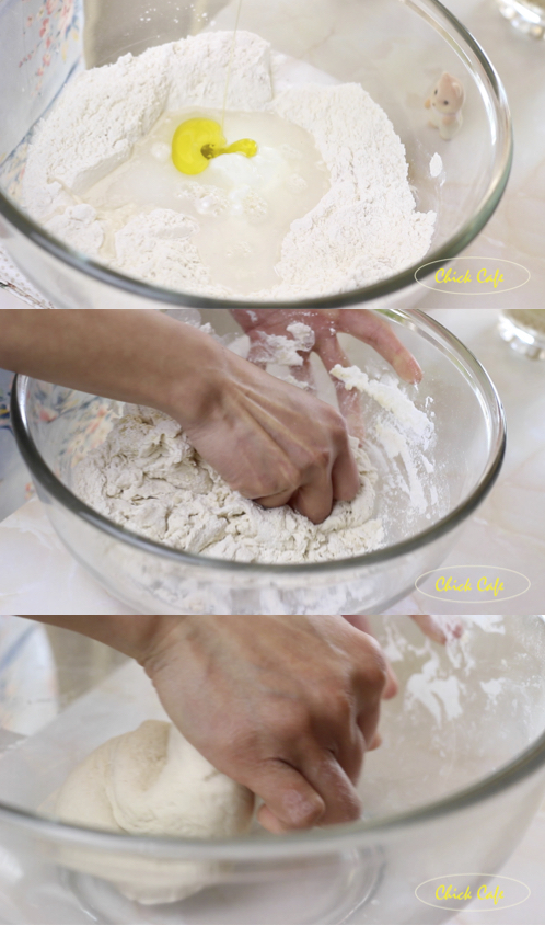 ใส่โยเกิร์ต น้ำ และน้ำมันมะกอกลงไป ผสมให้เข้ากัน จากนั้นนวดเป็นเวลา 10 นาที จนแป้งเนียน