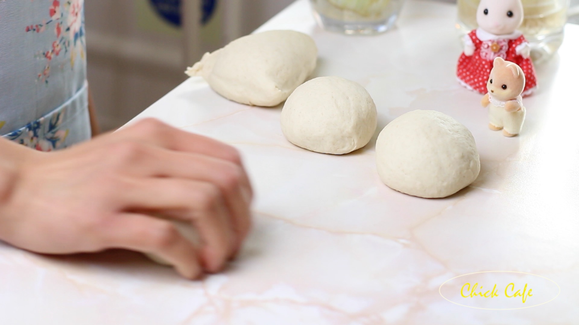 เมื่อแป้งฟูขึ้นมาแล้ว ให้แบ่งแป้งออกเป็น 4 ลูกขนาดเท่าๆ กัน จากนั้นคลึงให้เป็นก้อนกลมๆ