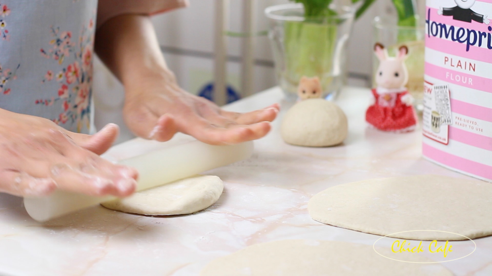 ใช้ไม้คลึง กดแป้งให้เป็นแผ่นแบนๆ