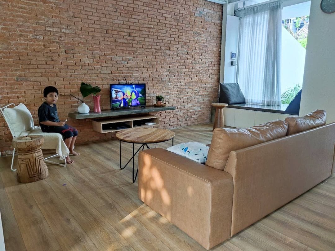 มุมนี้คือห้องนั่งเล่น ซึ่งเราจะเห็นความโดดเด่นของการตกแต่งผ่านการตกแต่งผนังอิฐโชว์แนวที่เข้ากับโทนสีน้ำตามจากองค์ประกอบอื่น ๆ ของห้อง