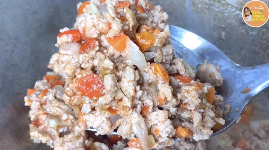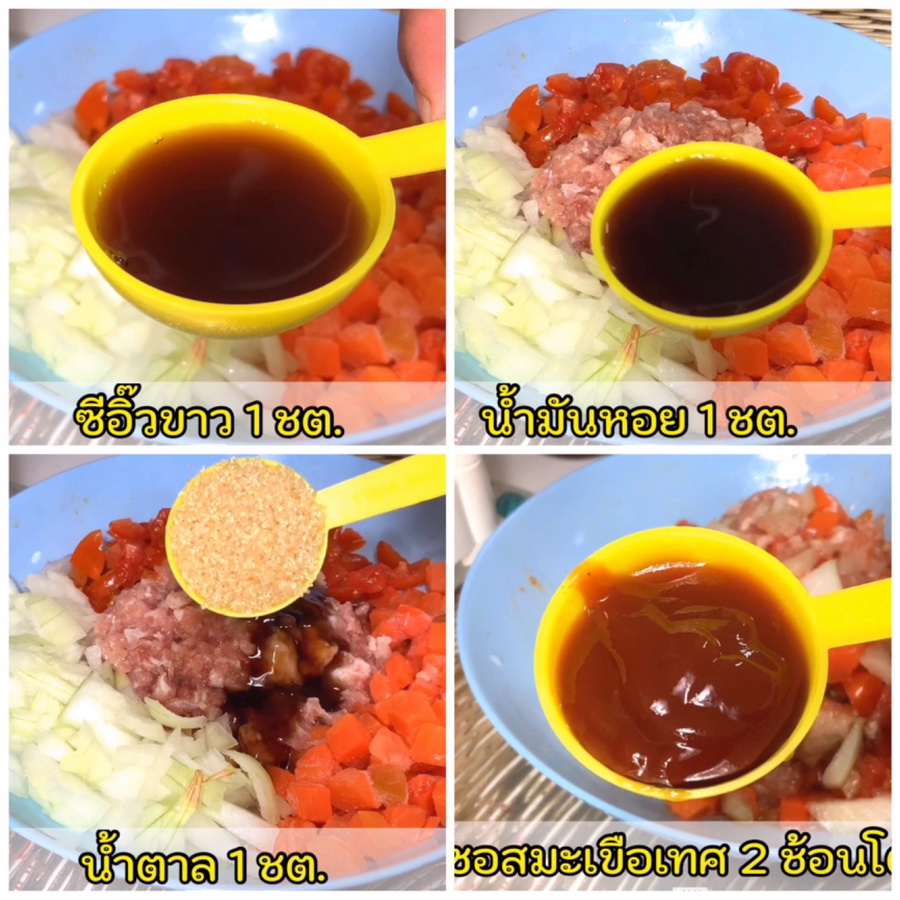 1. ปรุงรสไส้ให้อร่อย ด้วยการผสมหมูสับ มะเขือเทศ หอมใหญ่ แครอท ปรุงรสด้วยซีอิ๊วขาว 1ชต. /น้ำมันหอย 1 ชต./ น้ำตาล 1ชต. /ซอสมะเขือเทศ 2 ชต. ผสมให้เข้ากัน