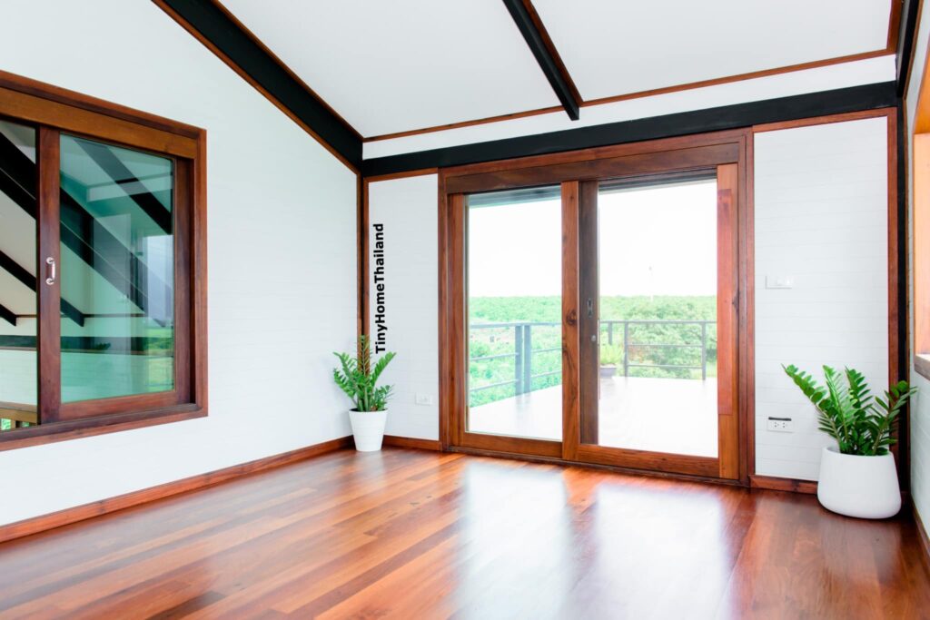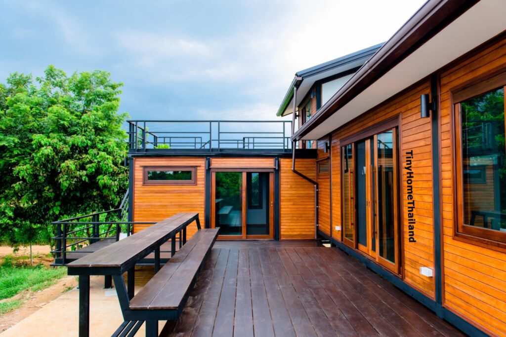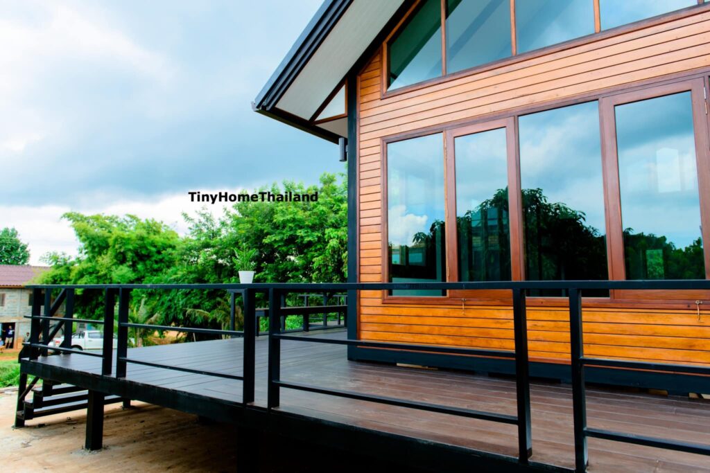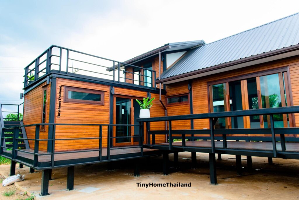 บ้านไม้โครงสร้างเหล็กสไตล์นอร์ดิก ผลงานบ้านจาก TinyhomeThailand บ้านสำเร็จรูป/น็อคดาวน์ บ้านที่ออกแบบโดยเน้นฟังก์ชันการพักผ่อน ด้วยการออกแบบโถงที่กว้างเป็นพิเศษ มีระเบียงกว้างขวาง พร้อมดาดฟ้าไว้ดูดาว เหมาะสำหรับทำเป็นรีสอร์ตหรือบ้านตากอากาศเป็นอย่างยิ่ง