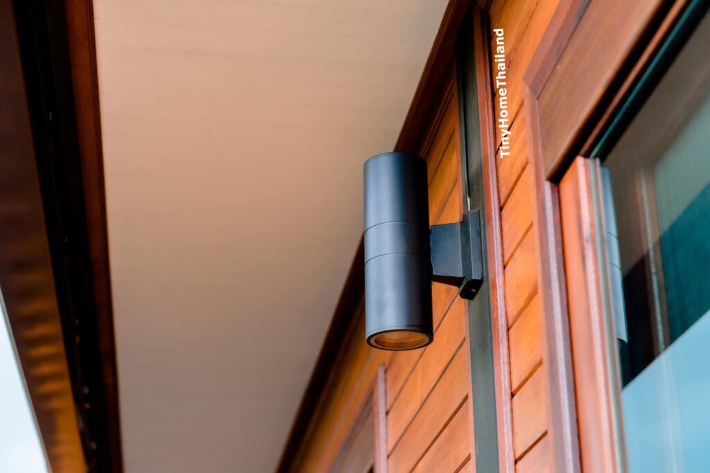 ลักษณะตัวบ้านชั้นครึ่ง โครงสร้างเหล็กกัลวาไนซ์ หลังคาทรงจั่ว ผนังภายนอกกรุด้วยไม้จริงทั้งหมด ตัดกับโทนสีดำของตัวโครงสร้างเหล็กได้อย่างลงตัว ประตูและหน้าต่างเลือกใช้กระจกโปร่งแสงซึ่งถูกติดตั้งไว้รอบบ้านหลายบาน รับแสงธรรมชาติได้อย่างเต็มที่