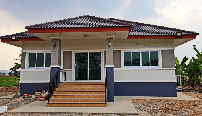 ลักษณะบ้านชั้นเดียวยกพื้นสูง เน้นการตกแต่งเรียบง่าย โครงสร้างก่ออิฐฉาบปูนแต่งแต้มด้วยโทนสีพื้นสบายตา ตัวฐานโทนสีฟ้าเข้ม รับกับผนังสีเทาอ่อน ปกคลุมด้วยหลังคากระเบื้องลอนทรงปั้นหยาสีเข้มแต่งเชิงชายสีส้ม มาพร้อมเฉลียงขนาดย่อมปูพื้นหินทราย เหมาะสำหรับจัดเป็นมุมนั่งเล่นรับลมเย็นนอกบ้าน