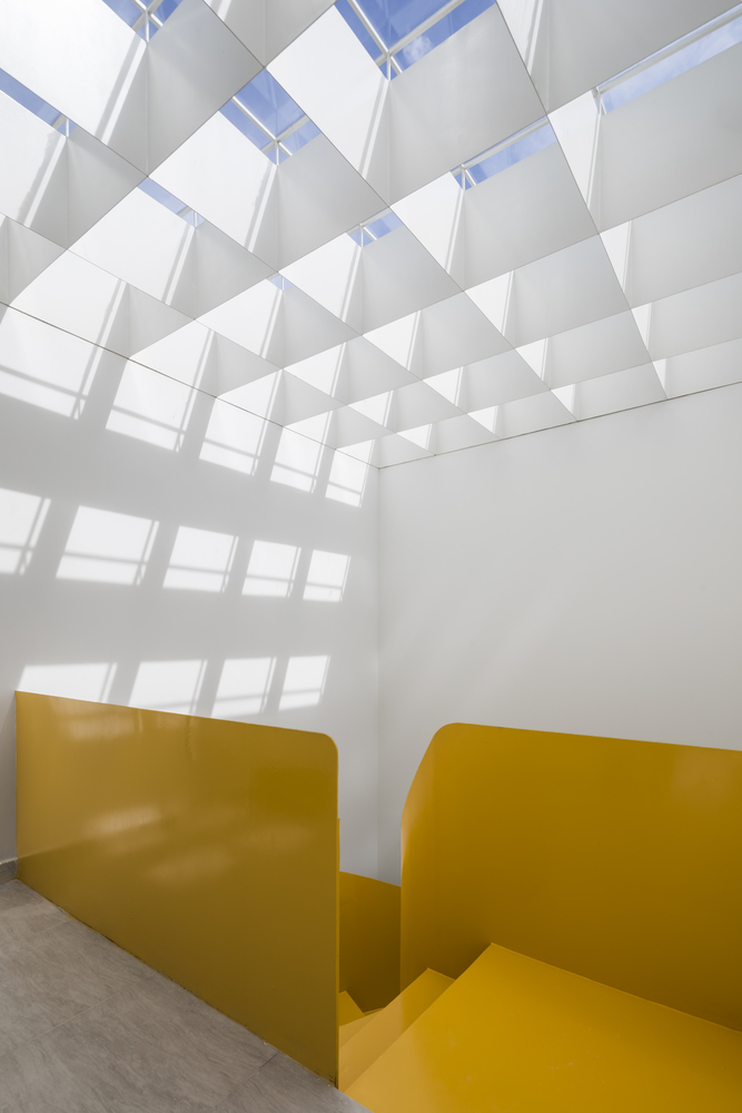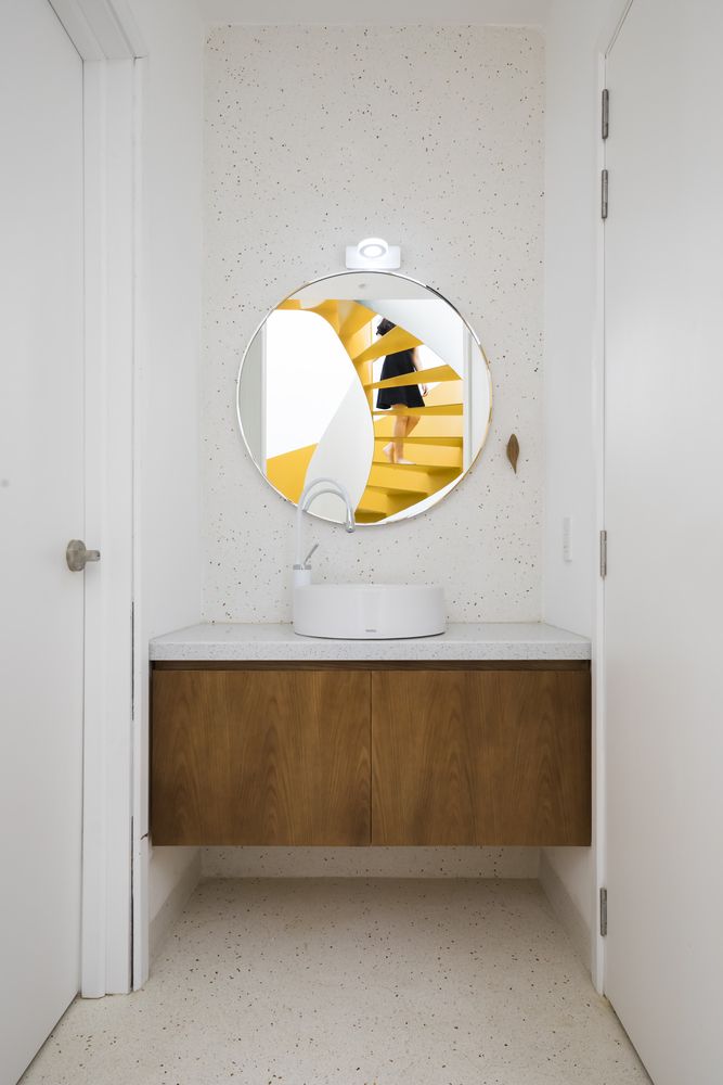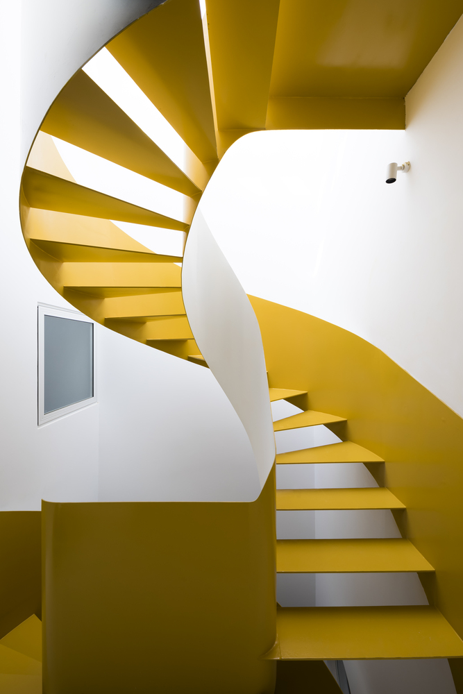 จุดที่เป็นไฮไลท์แห่งหนึ่งของบ้าน คือ บันไดวนแห่งนี้ ที่สถาปนิกตกแต่งในโทนสีเหลืองสดตัดกับผนังสีขาว ซึ่งเป็นการนำเอาดีไซน์แบบเรขาคณิตมาใช้ได้อย่างชาญฉลาดและสวยงาม