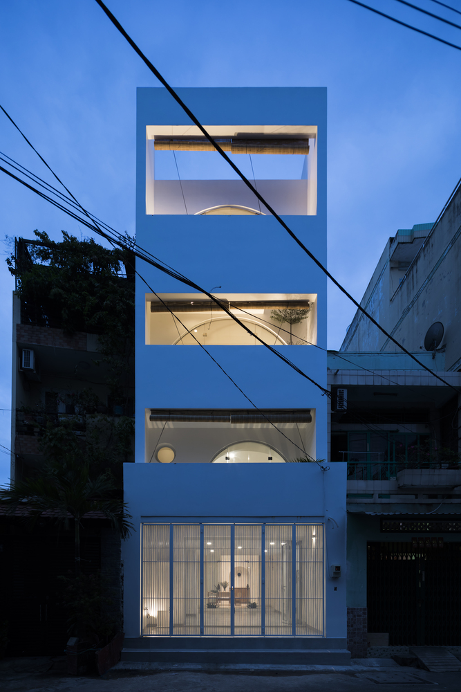 ตัวบ้านจะเป็นทาวน์เฮ้าส์แบบหน้าแคบ จึงมีข้อจำกัดที่ด้านข้างจะปิดทึบ ไม่สามารถรับแสงและลมได้ สถาปนิกจึงเลือกให้ด้านหน้าของอาคารทั้ง 4 ชั้น มีพื้นที่เปิดโล่งให้สามารถชดเชยแสงและลมจากด้านข้าง โดยในแต่ละชั้นจะมีมูลี่ไม้ติดเอาไว้ป้องกันแสงแดดในวันที่แดดจัด