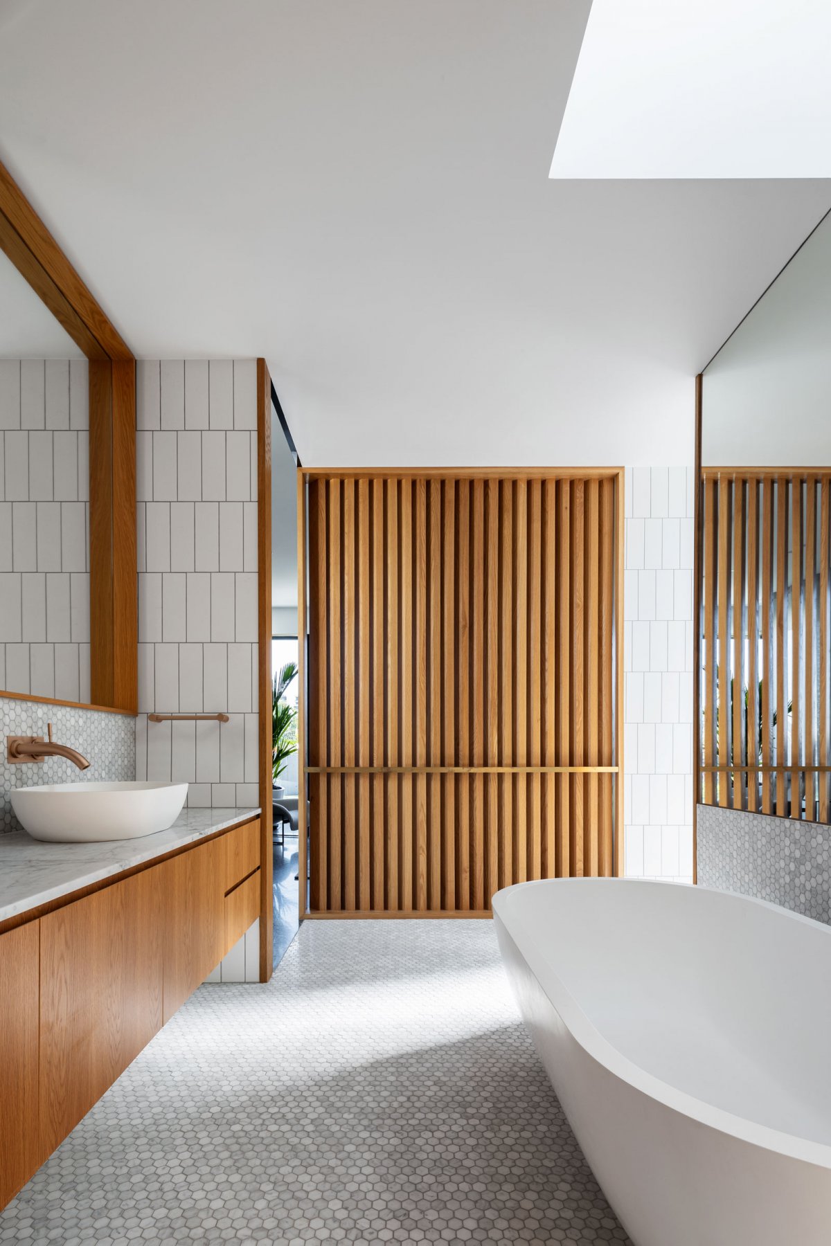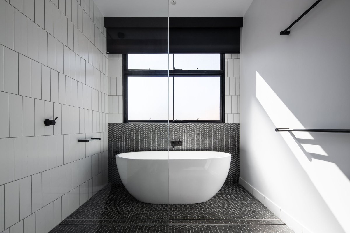 ห้องน้ำห้องนี้ถูกตกแต่งในโทนสีขาว-ดำ ซึ่งโทนสีขาวจะทำให้ห้องดูมีความสว่างขึ้นนั่นเอง ห้องน้ำจึงมีบรรยากาศที่ดูผ่อนคลายเป็นพิเศษ