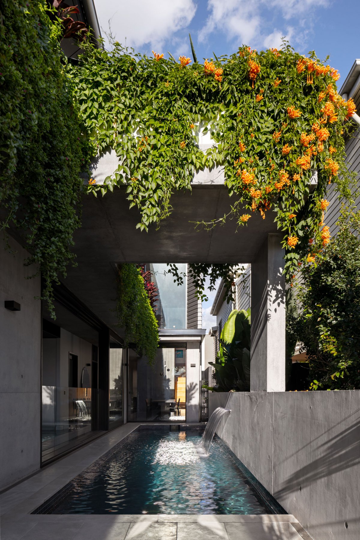 เมื่อเข้ามาภายในบ้าน เราจะสามารถสัมผัสบรรยากาศการออกแบบที่หลากหลายได้ทันที โดยอย่างมุมนี้จะเป็นสระว่ายน้ำส่วนตัวแบบกึ่งในร่ม ซึ่งให้บรรยากาศที่เป็นส่วนตัวสำหรับสมาชิกในบ้าน