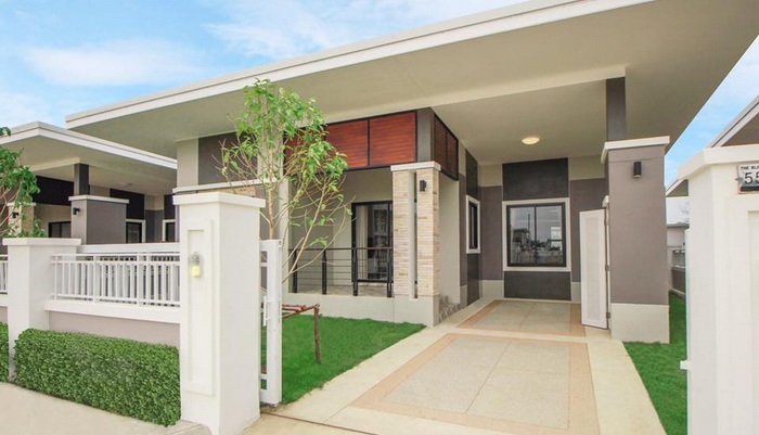 ลักษณะโครงสร้างเป็นบ้านชั้นเดียว หลังคาเพิงหมาแหงน ผนังใช้สีขาว-เทา ผสมผสานการตกแต่งด้วย เสาอิฐสีครีม และไม้ฝาสีแดง ช่วยให้บ้านมีมิติ ไม่แข็งทื่อจนเกินไป แล้วยังมีสนามหญ้าหน้าบ้าน เพิ่มความสดชื่นได้ไม่น้อย
