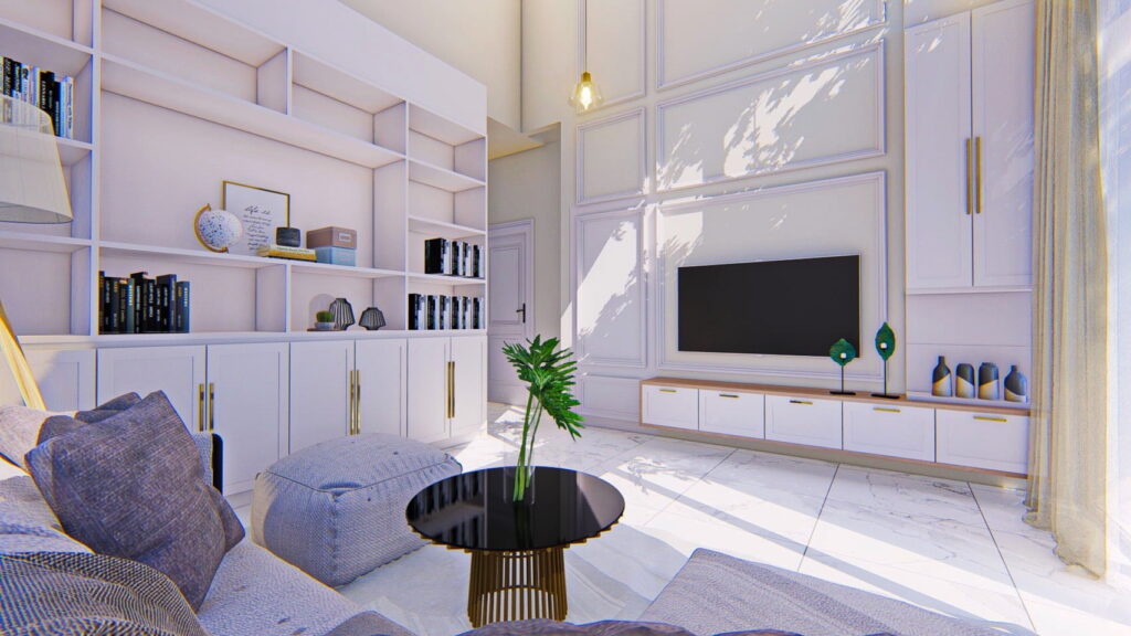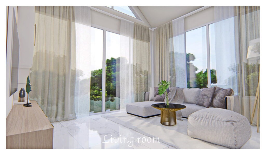 เมื่อเดินเข้ามาในบ้านจากประตูทางเข้าด้านหน้า จะพบกับห้องนั่งเล่นที่กว้างโปร่งสว่างไสว มีโซฟาทรงตัวแอลไว้พักผ่อนและรับชมความบันเทิง เลือกใช้ชั้นวางทีวีแบบไม้