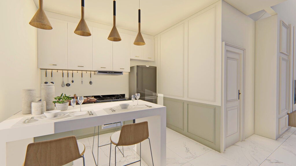 การตกแต่งภายในเน้นความโปร่งโล่งเป็นพิเศษ ด้วยการเลือกใช้หน้าต่างกระจกบานใหญ่และโทนสีขาวจากองค์ประกอบต่าง ๆ ไม่ว่าจะเป็นพื้นลายกระเบื้องหินอ่อน รวมไปถึงเฟอร์นิเจอร์บิวอินและลอยตัวต่าง ๆ นอกจากนี้ ยังดูอบอุ่นด้วยเฟอร์นิเจอร์และของตกแต่งจากไม้อีกด้วย