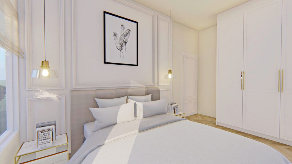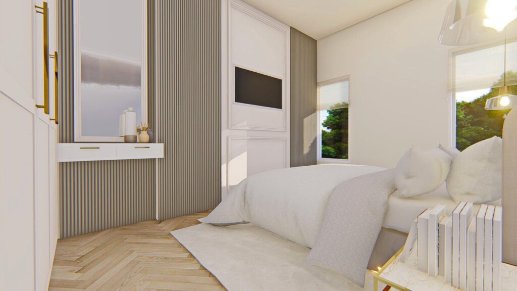 ห้องนอนนั้นเปี่ยมไปด้วยความอบอุ่นและเรียบง่ายจากพื้นไม้และโทนสีขาว มีตู้เสื้อผ้าบิวท์อินขนาดใหญ่ที่สามารถบรรจุเสื้อผ้าและของต่าง ๆ ได้อย่างเพียงพอ