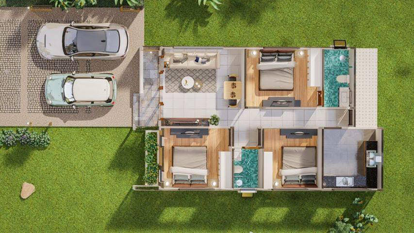 – พื้นที่ใช้สอย 120 ตร.ม. (ตัวบ้าน 85 ตร.ม. + โรงรถ 35 ตร.ม.)