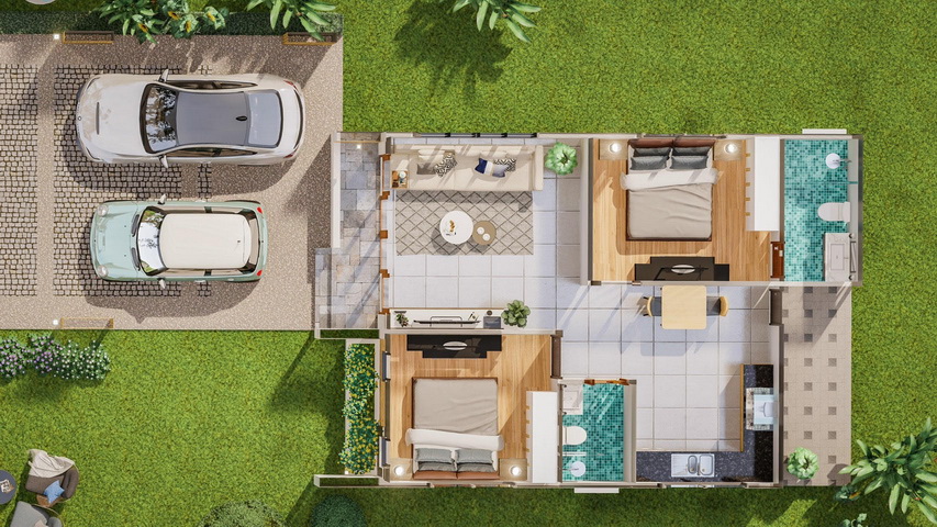 สถาปนิกได้ออกแบบบ้านหลังนี้เป็นสองรูปแบบด้วยกัน คือ แบบ 2 ห้องนอน และ แบบ 3 ห้องนอน