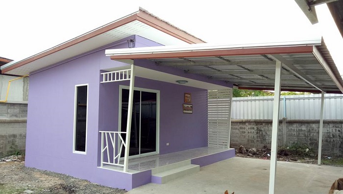 บ้านหลังนี้เป็นผลงานการก่อสร้างจากคุณ ธนวัฒน์ โชติช่วงธนกิจ ดีไซน์โมเดิร์น ผนังด้านนอกตกแต่งด้วยสีม่วงสดใส หลังคาทรงเพิงหมาแหงน ด้านหน้ามีลานคอนกรีตพร้อมชายคาแบบง่ายๆ
