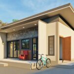 ตัวบ้านชั้นเดียวขนาดเล็ก รูปทรงกล่องสี่เหลี่ยม หลังคาเพิงหมาแหงน ดีไซน์ยกพื้นสูง มีเฉลียงทางเข้าขนาดเล็ก พร้อมระเบียงไม้ยกพื้นข้างบ้านสำหรับเป็นพื้นที่กิจกรรมหรือพักผ่อนชมวิวภายนอก