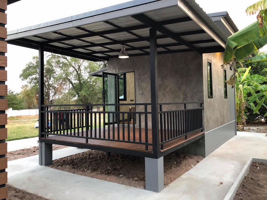 บริเวณนี้คือระเบียงข้างบ้าน ออกแบบให้เป็นระเบียงยกพื้นมีใต้ถุนโปร่ง ปูพื้นด้วยกระเบื้องลายไม้ เข้ากันได้ดีกับโครงเหล็กสีดำและผนังปูนเปลือยของตัวบ้าน
