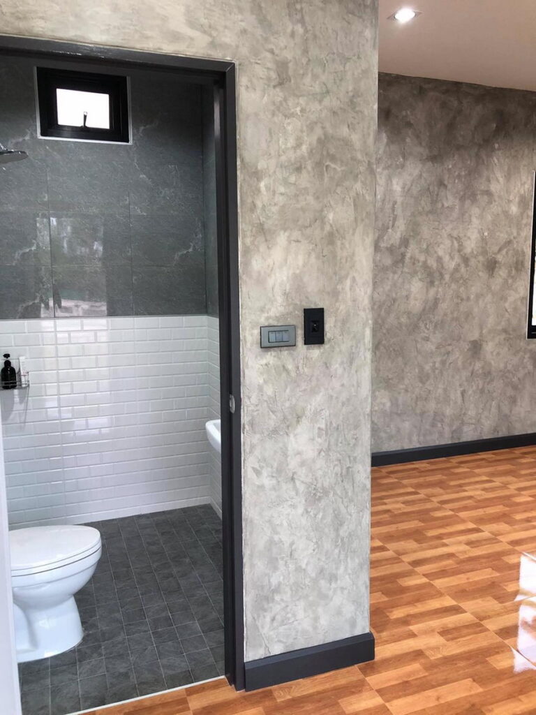 ภายในบ้านมีห้องน้ำเล็กๆ 1 ห้อง ตกแต่งด้วยกระเบื้องหินสีเทาและผนังลายอิฐสีขาว พร้อมผนังกระจกแยกพื้นที่แห้ง-เปียก กะทัดรัดแต่สะดวก ให้บรรยากาศที่แตกต่าง แต่ก็ก็มีความน่าใช้งานไม่น้อย