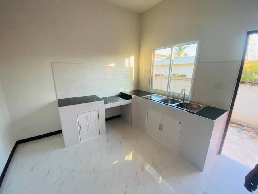 เช่นเดียวกันกับห้องครัวที่ยังคงเน้นความโปร่งสบายด้วยหน้าต่างบานใหญ่ที่จะช่วยระบายกลิ่นและควันได้เป็นอย่างดี ภายในห้องยังติดตั้งด้วยเคาน์เตอร์ครัวแบบติดผนังพร้อมฟังก์ชันการใช้งานที่ครบครัน