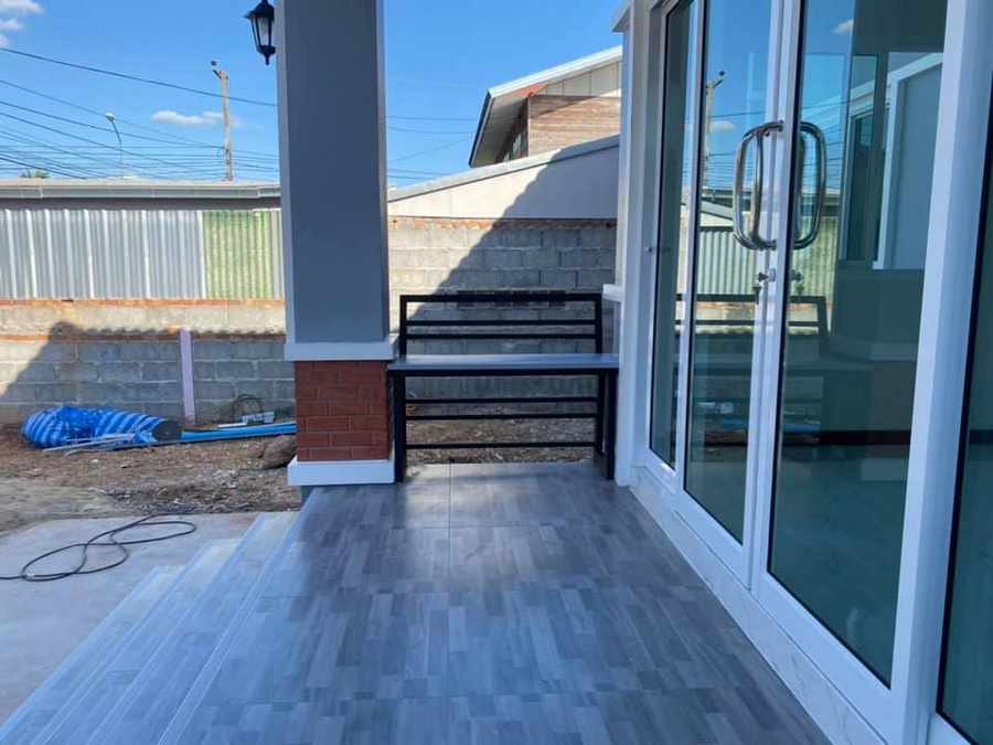 บริเวณทางเข้าก้านหน้าบ้านออกแบบเป็นเฉลียงขนาดพอเหมาะ พร้อมกับม้านั่งสองด้าน จึงเป็นมุมพักผ่อน หรือมุมสำหรับต้อนรับผู้มาเยือนได้อย่างเหมาะสม