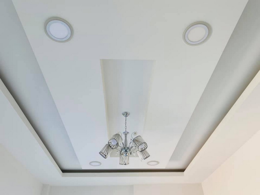เมื่อเข้ามาภายในบ้าน เราก็จะพบกับห้องโถงหลักที่มีพื้นที่โปร่งสบาย ภายในตกแต่งในโทนสีขาวครีม เพดานห้องเป็นแบบหลุม พร้อมกับโคมไฟดีไซน์โมเดิร์น