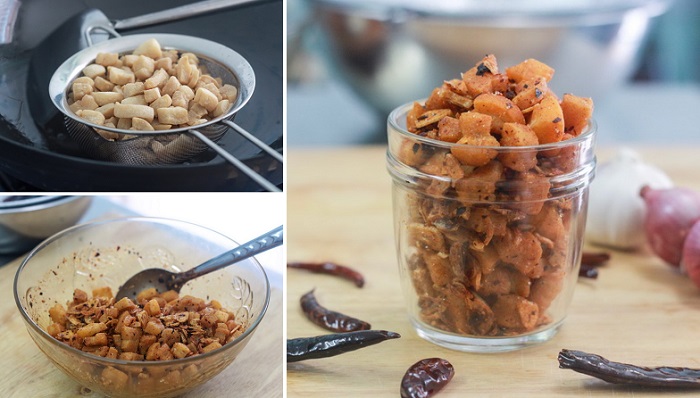 4. ให้นำกระเทียม หอมแดง และพริกมาเจียวในน้ำมันจนเหลืองกรอบ